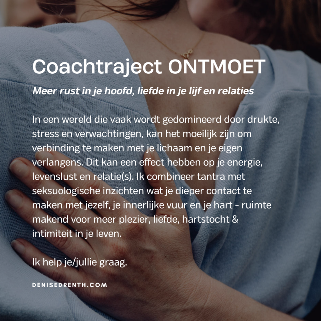Ik ben Denise Drenth, een levenslustig, mensgerichte trainer, tantra-coach én seksuoloog. Ik heb al meer dan 3.000 mensen begeleid naar meer rust, liefde en bewuste verbinding waar (energetisch) leiderschap centraal staat. Vanuit diezelfde passie creëer ik veilige, zachte ruimtes waarin jij mag zakken in je lijf, je hart kunt laten spreken en je verlangens tot leven komen. Dit voor jou als individu, en jullie als koppel.