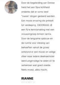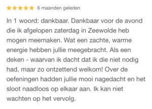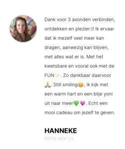 ‘Ik voel me tijdens deze avonden helemaal verbonden met wie ik in de kern ben. Het maakt me zacht en liefdevol naar mezelf en de wereld om mij heen. Er is niets fijners dan dit gevoel:-)’