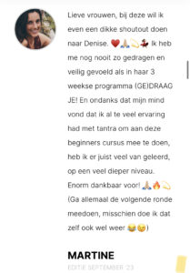 ‘Ik raad (GE)DRAAG JE echt aan! Ik vond het heerlijk om de avonden in m’n vrouwelijke energie te zakken. Op een hele fijne en relaxte manier ontdekken wat dat ook alweer is en wat het met je doet. Ook het connecten met andere vrouwen hierover is zo waardevol. Ik voelde me echt gedragen door de groep en het helpt me nog steeds mezelf te dragen. ❤️ Elke avond weer een ander thema met bijzondere oefeningen vol liefde en compassie, waardoor ik telkens weer een stukje lichter en meer gedragen naar huis ging. Echt een mooi cadeau om jezelf te geven.’